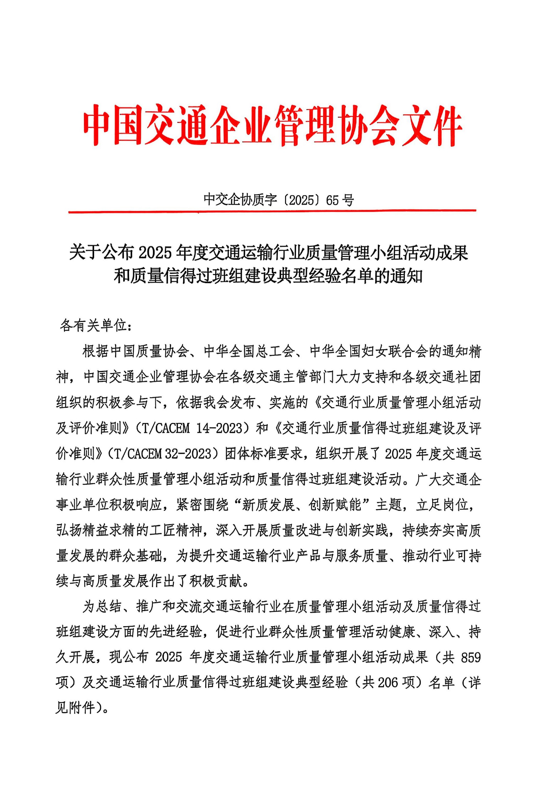 2025年11月20日,中國(guó)交通企業(yè)管理協(xié)會(huì)公布了年度交通運(yùn)輸行業(yè)質(zhì)量管理小組活動(dòng)成果獲獎(jiǎng)名單。開發(fā)路東延快速化改造工程“瑞沃···